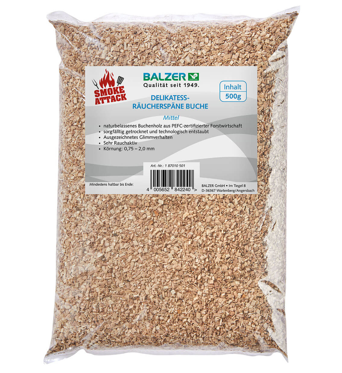 Prírodné bukové drevo z udržateľného PEFC-certifikovaného lesného hospodárstva, starostlivo spracované pre profesionálne údenie.