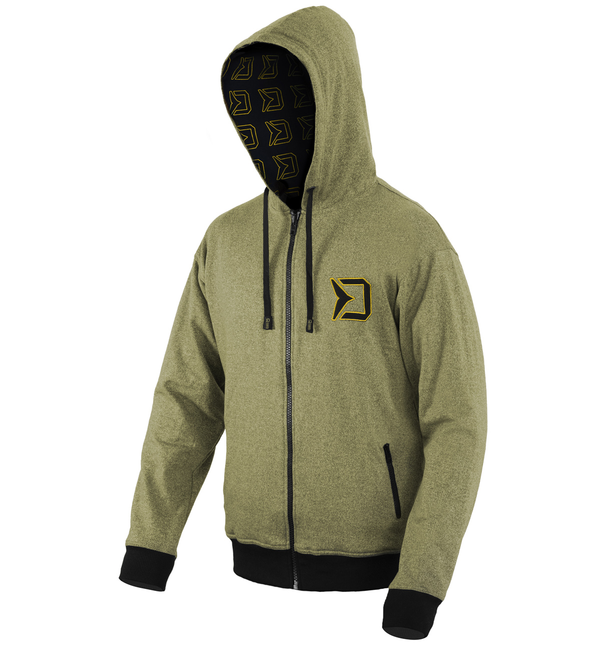 Mikina Delphin RAWER TWO je séria štýlových mikín s kapucňou, ktorá prináša novú dimenziu komfortu. Dostupné sú v tmavozelenej farbe a doplnené o tmavozelené manžety na páse a rukávoch. Poznávacím znakom tejto série je praktický zips, ktorým vieme mikinu úplne rozopnúť a dve oddelené vrecká na zipsy, ktoré boli navrnuté tak, aby si do nich mohol rybár pohodlne odložiť svoje ruky. O vysokej kvalite tohto produktu svedčí aj použitie špičkových zipsov značky YKK. Ťaháčiky zipsov majú na sebe logo Delphin. Vzadu nájedeme veľké logo Delphin, vkusne olemované zelenou farbou. Vpredu vľavo na hrudi nájdeme rovnaké logo malých rozmerov. Kapucňa je z vnútornej strany doplnená o čiernu látku s potlačou loga Delphin. Kapucňu viete stiahnuť jednoducho šnúrkami čiernej farby, na ktorých koncoch sa nachádza našité logo Delphin RAWER. To isté logo vo väčšom rozmere nájdeme našité aj na manžete vpredu dole na ľavej strane.