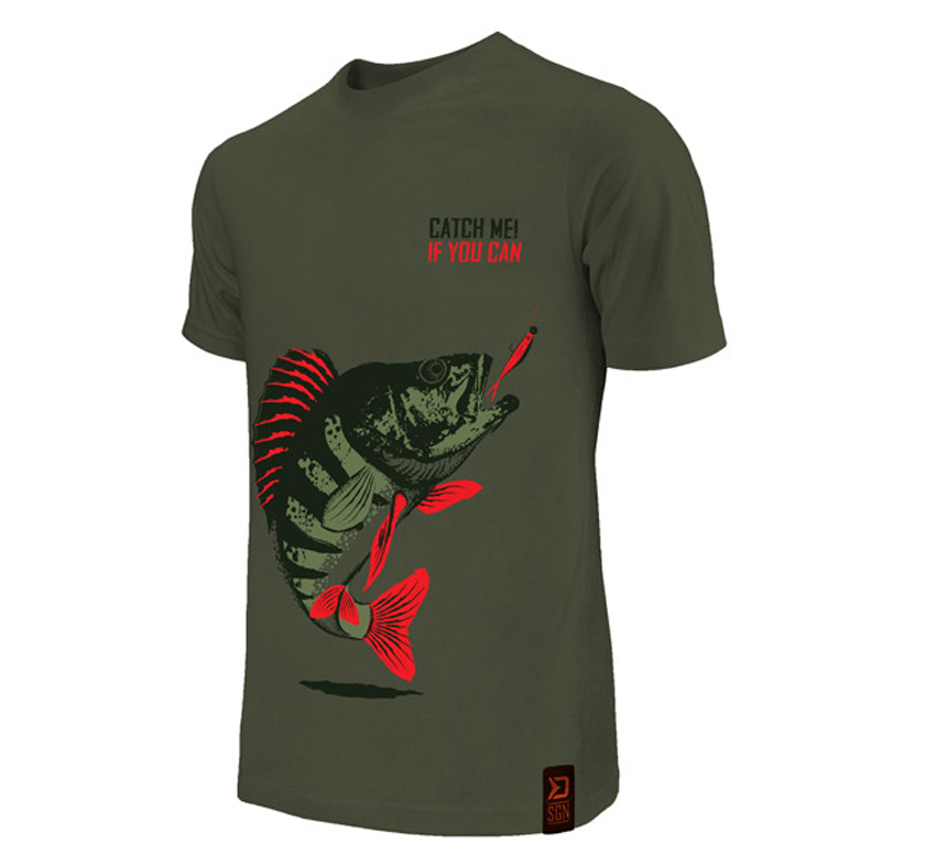 Tričko Catch me! OSTRIEŽ je dizajnované v tmavo zelenej farbe s vyobrazením ostrieža, ktorý sa práve blíži k nástrahe, čo je moment, na ktorý čakajú všetci priaznivci lovu týchto rýb.
