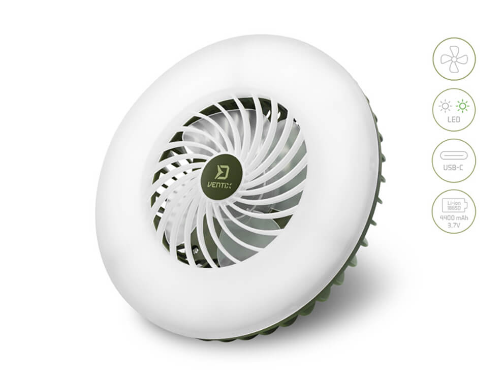 Zariadenie ponúka dve úrovne bieleho svetla (350 lm a 180 lm) a zelené svetlo, pričom výdrž batérie dosahuje až 14 hodín. Ventilátor si môžete nastaviť v troch intenzitách podľa aktuálnych podmienok s výdržou od 11 do 19 hodín.
